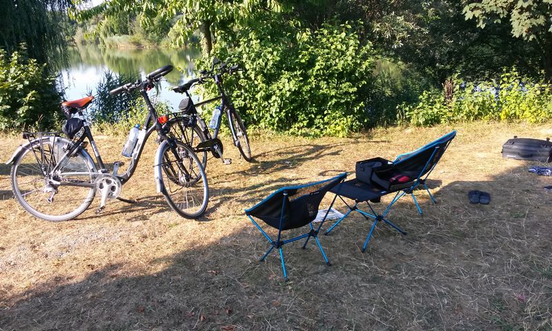 Rond 16 uur weer teruggefietst, ijs in het dorp gegeten en in de plas op de camping gezwommen. Daarna bespreken we de verdere plannen en besluiten morgen terug te gaan richting Heidelberg.