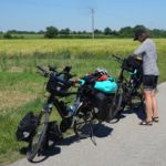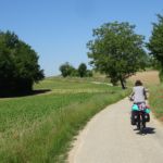 De tocht gaat verder door bosrijk gebied. De GPX blijkt hier totaal niet te kloppen met het boekje en beide sporen ook niet met de wegwijzers. We besluiten maar op de wegwijzers te vertrouwen en dat gaat prima. Nou is de Via Rhôna route ook nog niet af, dus dit soort dingen kunnen gebeuren. Onderweg geluncht met stokbrood van de bakker en kaas van de supermarkt. We klappen daarvoor onze stoeltjes uit en worden soms jaloers bekeken door andere fietsers. Je komt soms ook heel lang geen enkel bankje tegen. Dat moet ook allemaal nog komen hier.
