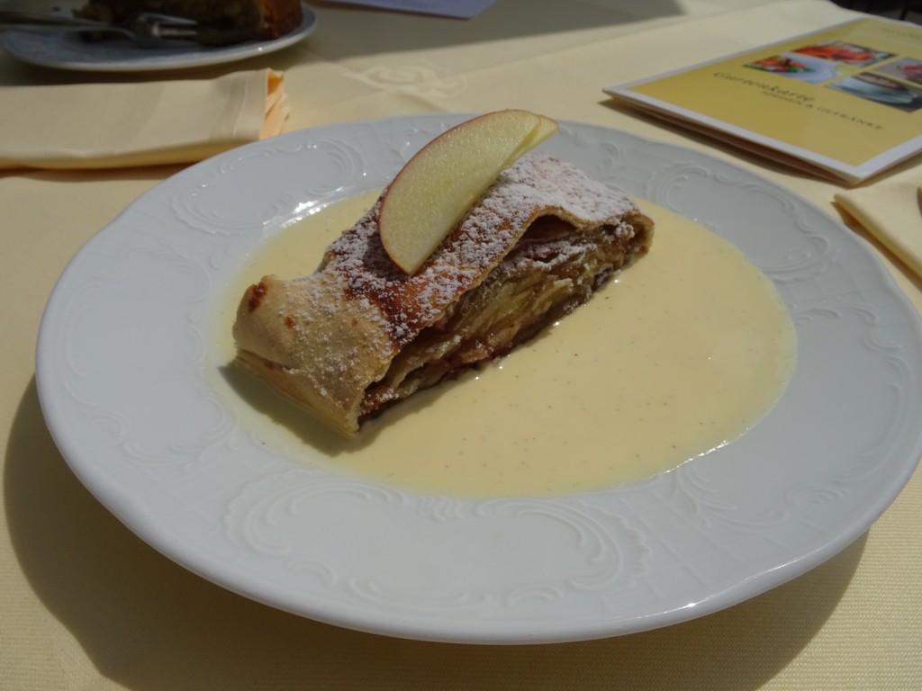 Omdat gisteren de supermarkten dicht waren geen yoghurt als 1e ontbijt, dus na het opstaan en douchen meteen maar naar de Bäckerei in het dorp voor koffie en een zoet broodje. En daar moesten we 1,5 uur blijven vanwege de regen. Och, het kan erger. Na 3 cappu’s voor Wim en 2 koffie voor Renée kunnen we verder. De rest van de dag blijft met droog en mooi weer. Waardeloze weerapps!