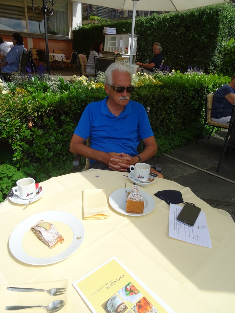 Om 17 uur naar het café op de camping (waar we nog helemaal niet geweest waren) voor een Nussecke, een taartje dat ik toch nog even moest proeven. Renée neemt een stukje tiramisu. Om 17 uur weer bij de tent en aan de wijn.