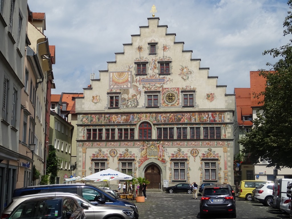 Per auto vervolgens naar Lindau en daar per fiets verder. We gaan eerst naar het eilandje van Lindau, waar het al behoorlijk druk is. Dit lijkt ons ook een plek voor veel chinezen en japanners, maar die zijn er gelukkig niet. Koffie gedronken met een beste stuk taart (op z’n duits). Ik besluit meteen dat een lunch voor mij niet meer nodig is. We bekijken een man, die als standbeeld van Mozart staat en na het werpen van een munt je probeert met z’n charme en fluitjes in te palmen. Erg leuk gedaan. Daarna verder naar Bregenz via gelukkig vlakke fietspaden, want klimmen willen we zeker niet vandaag. Opvallen is het grote aantal fietsers wat je tegenkomt. De Bodenseeroute is erg populair. Na een km of 20 houden we het voor gezien en keren terug naar Lindau. Vlak daarbij moet nog wel het regenjasje aan, want er valt een licht buitje, maar veel stelt het niet voor. We willen ook op tijd bij het Beierse restaurant zijn om niet weer tegen een nee aan te lopen zoals zaterdag. Maar het valt wel mee met de drukte en we kunnen er terecht. Na het eten gaan we nog even rondwandelen door het dorpje.