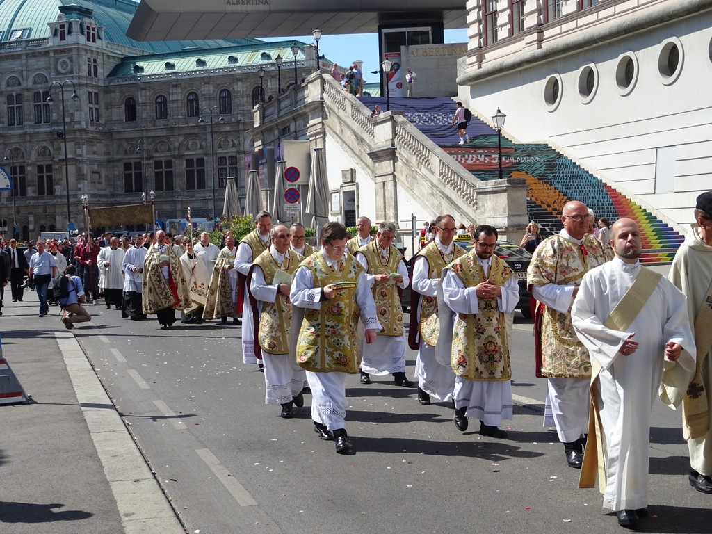 Na de koffie op een terras horen we ineens een enorm lawaai. Alle kerkklokken beginnen als een dolle te luiden. En er komt een processie aan met priesters, kinderen, volwassen, een monstrans, koperorkest en zingende paters. Het is Sacramentsdag en dat vieren ze hier op dag 10 na Pinksteren. Vandaag dus. (Helaas zijn daardoor ook alle winkels dicht! Daar komen we nu pas achter.) De processie eindigt bij de St Stefans kathedraal, waar een openlucht mis opgedragen zal worden.
