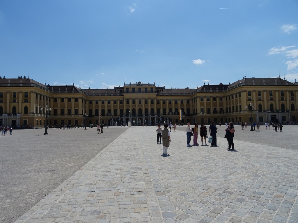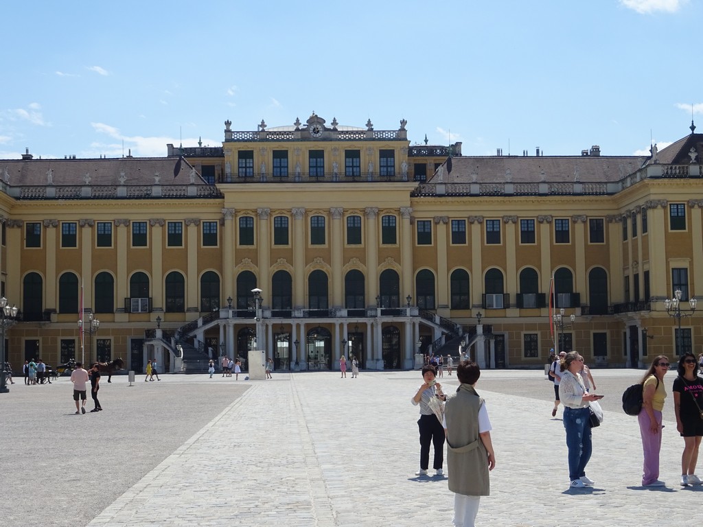 We lopen nog wat rond en besluiten na de lunch (wederom op een terras) per metro naar slot Schönbrunn te gaan. Volgens mij was dat het mooie kasteel van keizerin Sissi. Daar aangekomen valt het tegen. Geen mooi kasteel, vinden we. Bovendien, als je het kasteel zou willen bezoeken moet je een kaartje kopen en daarna tenminste 2 uur wachten voordat je naar binnen kunt. En heel grote delen van de tuin zijn gesloten voor publiek (’s avonds blijkt dat in deze tuin hét concert van het jaar zou plaatsvinden, ook al ter gelegenheid van Sacramentsdag). Wisten we ook niet …