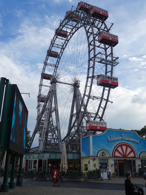 Tenslotte op weg naar het Prater complex. Maar het begint te regenen, dus in het park eerst maar eens een glaasje wijn op een terras. Het begint steeds harder te regenen, dus meteen ook maar gedineerd daar. Na afloop toch nog even langs het gedeelte van het Prater met het reuzenrad. Dat is inmiddels meer een normale kermis, met alle herrie van dien. Nog wel even het oude reuzenrad bekeken en daarna per metro/tram terug naar het hotel. We zijn erg moe van het vele wandelen.