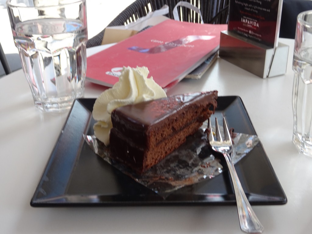 We hebben nog tot 14 uur voordat we terug bij het hotel voor de terugreis moeten zijn en we kunnen Wenen dus opnieuw in. Renée heeft nog steeds niet de Sacher Torte geproefd en dat moet toch echt nog even. We nemen een koffie en wandelen wat rond. Een 2-tal boekwinkels bekeken. Bij één van de koffiestops kan Renée eindelijk haar Sacher Torte proeven. Ik vind hem niet heel bijzonder, maar daar gaat het natuurlijk niet om. We kijken ook nog even naar binnen bij het Sacher hotel. Het ziet er chique en duur uit. Daarna per tram weer terug naar ons hotel. De chauffeur van het busje staat al klaar en helpt bagage en fietsen stouwen. De lunch doen we maar even op de stoeprand, want in het busje wordt het anders maar wat kruimelig.