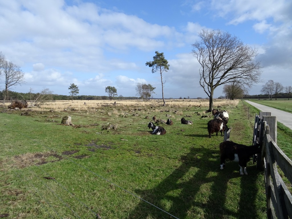 We trekken verder door de Anserdennen (met een theehuis dat nog dicht is) en het Anserveld. Daar loopt een kudde geiten rond. Twee geiten lopen echter buiten de omheining en als we staan te kijken loopt er eentje snel weer door de omheining (met schrikdraad!) terug de omheining in. Tja, pubers zeker.
