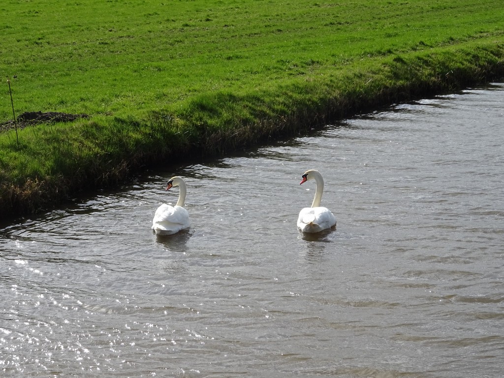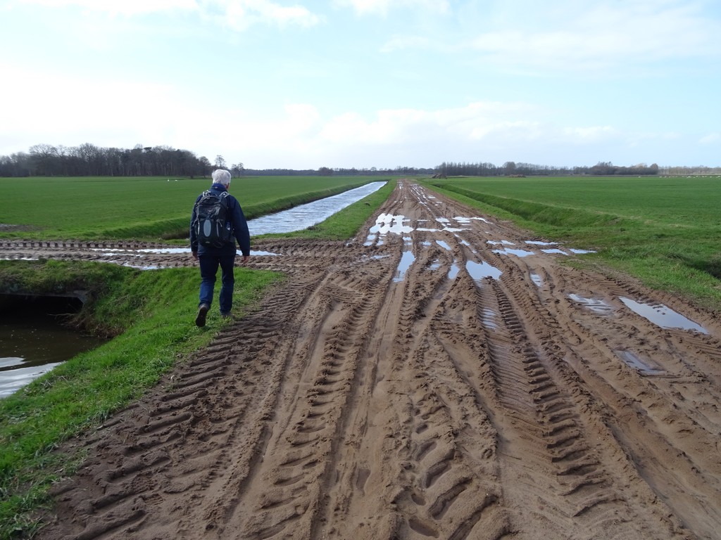 Wat verderop lopen we langs akkers en weilanden. Het pad daar is wel erg modderig geworden door alle regen van de laatste weken en we moeten een beetje door de berm lopen. Verderop passeren we de Oude Vaart en de Drentse Hoofdvaart en lopen we Uffelte binnen. Uffelte is van oudsher ook zo’n oud Drents dorpje met veel oude boerderijen. Wat een beetje jammer is dat aan de andere kant van de hoofdstraat allemaal lelijke nieuwbouw staat. Dat contrasteert wel erg met de oude boerderijtjes. Ook zien we dat sommige oude, wat grotere boerderijen helemaal zijn opgeknapt en zijn ingedeeld als meerdere woonhuizen, tot soms 4 stuks aan toe. Ook wel jammer eigenlijk, want erg goed geslaagd is dit ook niet. Aan de andere kant is het opknappen en onderhouden van deze oude boerderijen voor particulieren natuurlijk niet te betalen. Dus zeg maar even hoe het dan wel moet!