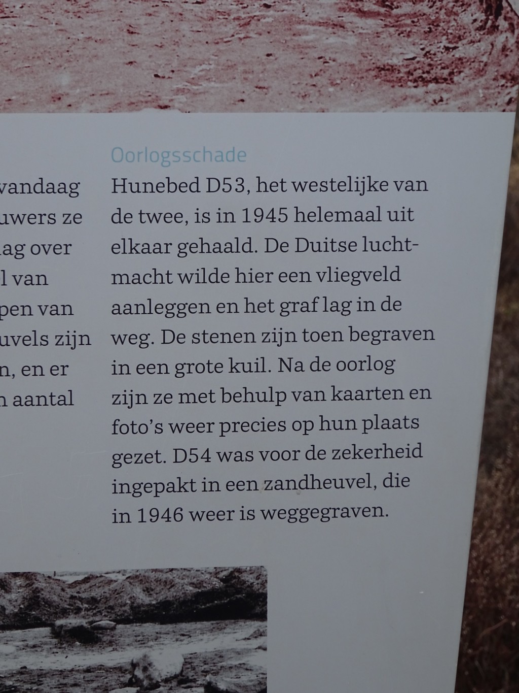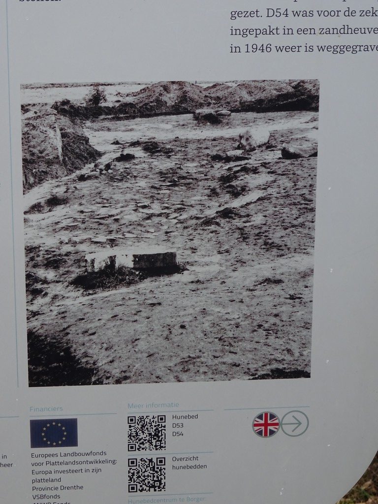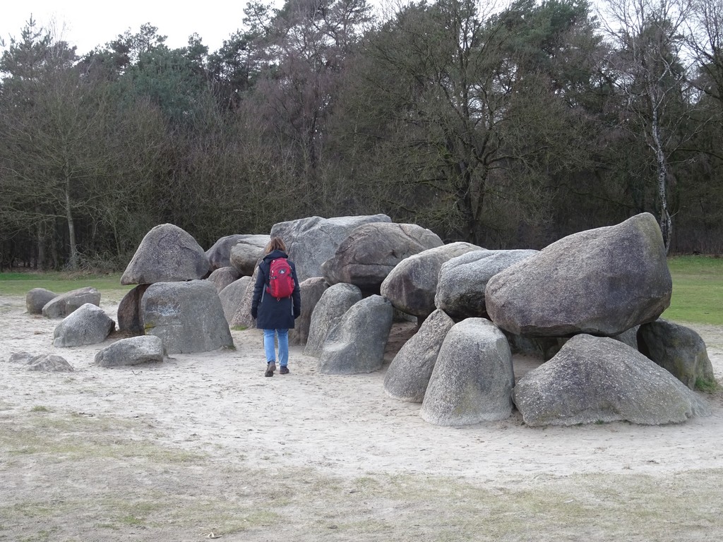Ook in Uffelte is een café open en we zijn inmiddels al zo’n 11 km onderweg zonder rusten, en we willen wel even zitten eigenlijk. Buiten is echt te koud, dus dan maar naar binnen voor een koffie. Voorbij Uffelte wordt het weer een en al natuurgebied zoals het Uffelterzand en het Holtingerzand. Het verhaal in ons wandelboekje rond het vliegveld dat de Duitsers hier in de jaren 40 wilden hebben aangelegd en waarvoor een hunebed moest wijken is erg interessant. De rol van archeoloog Professor van Giffen daarbij wordt ook toegelicht (zie foto’s).