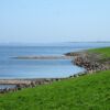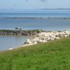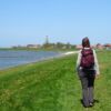 Het is even opletten, want er lopen hier 3 wandelpaden langs: het Zuiderzeepad, het Groot-Frieslandpad en het Elfstedenpad, dat wij lopen. Maar dankzij de Osmand routeplanner op m’n telefoon is dat geen enkel probleem. We lopen hier voornamelijk op de dijk en hebben een riant uitzicht op het IJsselmeer. We lopen tussen de schapen door die hier in grote getale met hun lammetjes op de dijken zijn gehuisvest. We hebben onderweg slechts 2 koeien gezien en honderden schapen. Een nadeel is wel dat je broekspijpen vrij snel onder de schapenpoep zitten. Een enkele keer mag je niet over een bepaald dijkperceel en moet je verder over de weg langs de dijk. En dan mis je meteen veel uitzicht. Maar ’t scheelt in de poep ?.