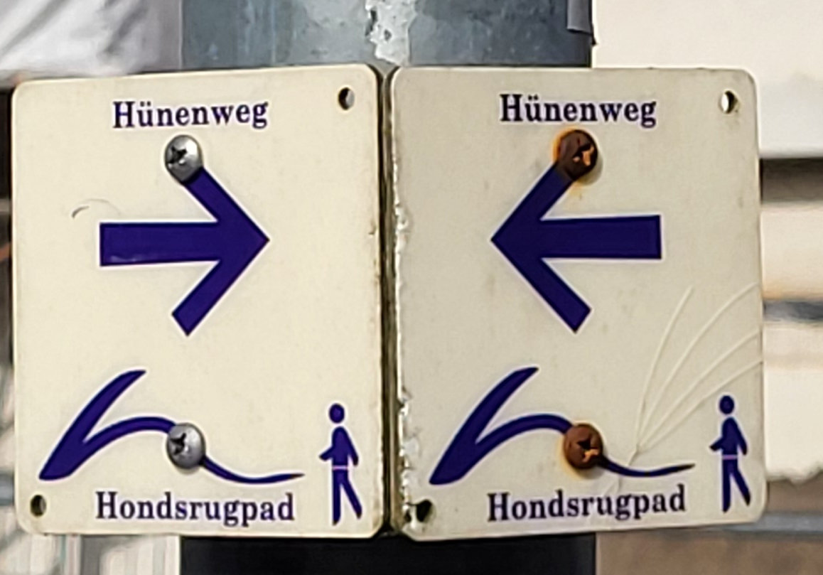 We stallen de auto op de P&R langs de A28 bij Haren en kunnen met buslijn 5 naar Groningen. We stappen uit bij het hoofdstation en lopen naar café Willem-Albert op de Grote Markt voor de koffie. We starten meteen met het meten van de km’s, want de 1e etappe zelf is 10,6 km, en we hebben dus wat extra km’s nodig om aan de norm te voldoen. Na de koffie terug naar het hoofdstation, want daar start de Hünenweg eigenlijk.