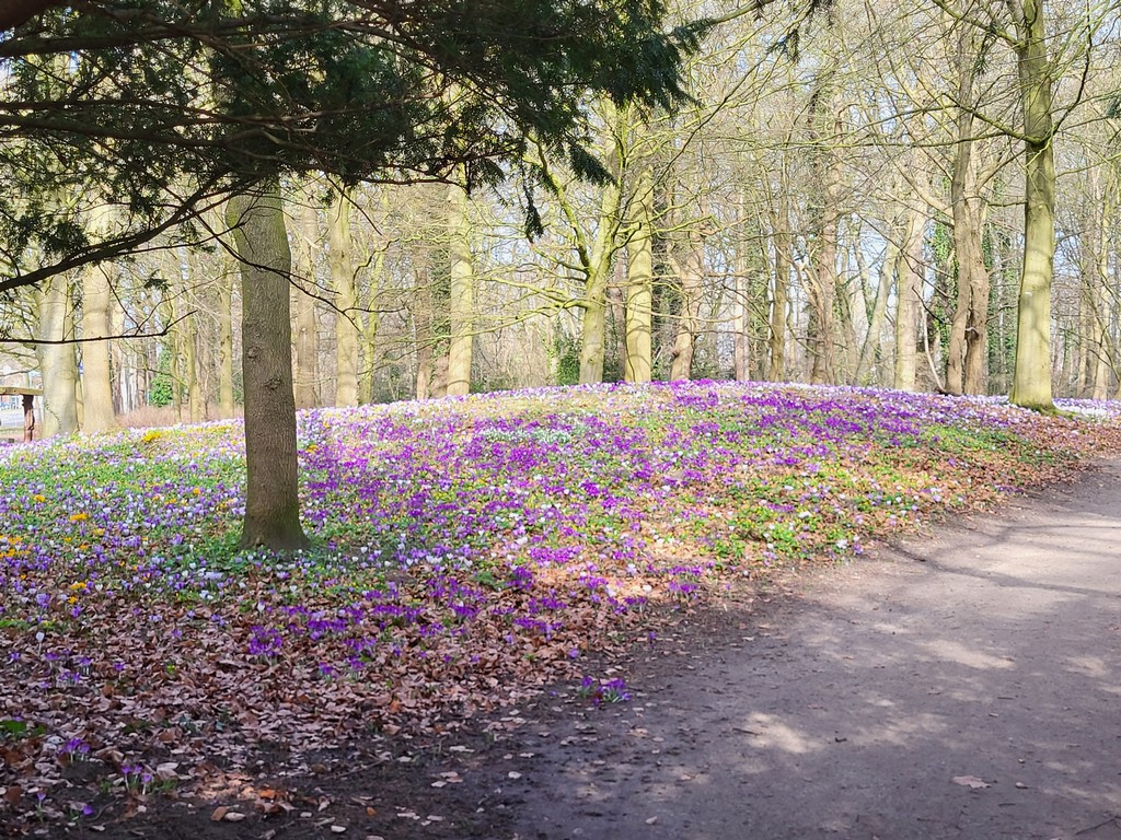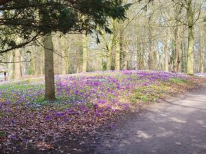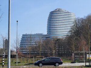 Onderweg valt weer het gebouw van DUO op (ministerie van Onderwijs), in de volksmond het Cruiseschip genoemd, dat in 2011 in gebruik werd genomen. Verder zien we daar al de bloemetjes bloeien dit voorjaar