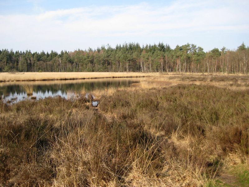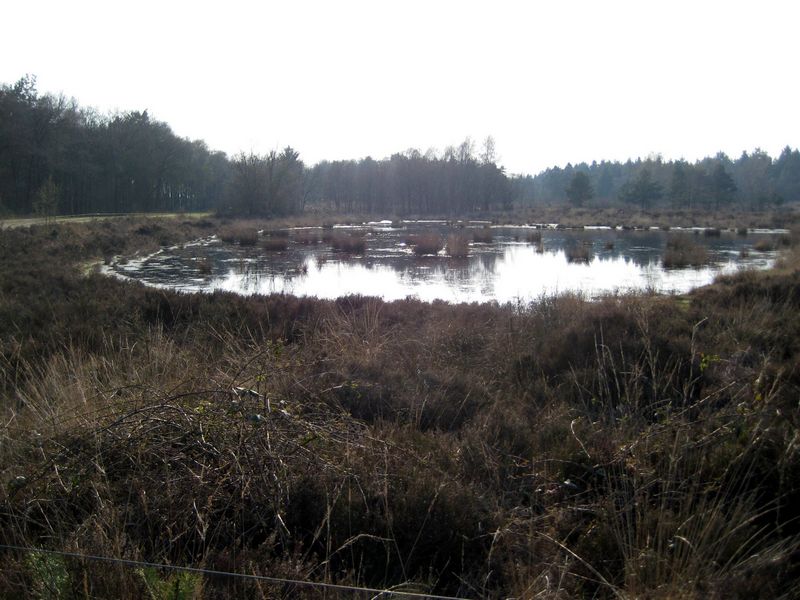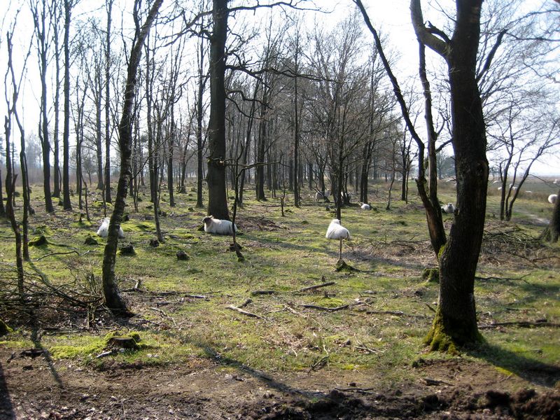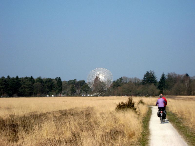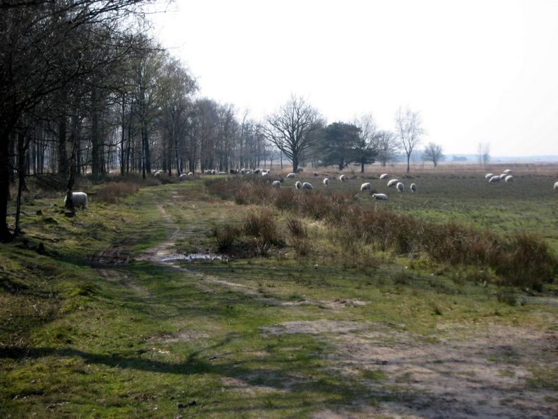 We lopen verder in westelijke richting en komen langs een schaapskooi waar allemaal pasgeboren lammetjes gehuisvest zijn. Iets verderop passeren we de (door zendamateurs) gerestaureerde radio-telescoop, die er mooi bijstaat in het zonlicht. Vervolgens gaat het verder over de heide richting Ruinen. Het valt op dat het hier redelijk nat is. Het lijkt erop dat de heide expres natter gemaakt wordt. Wellicht om nieuw veen te laten aangroeien?