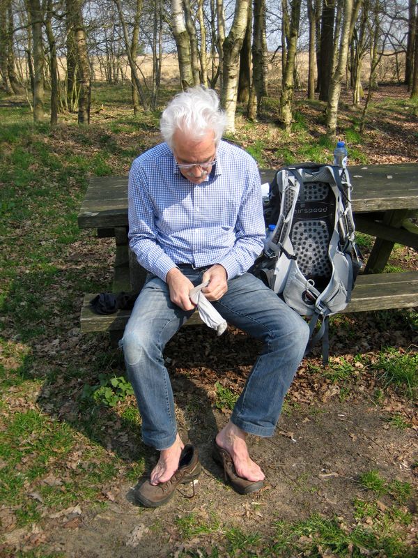 In Ruinen gaan we even koffiedrinken op een terras buiten, de temperatuur is hoog genoeg nu. We overleggen even over het vervolg. We willen elk jaar minimaal 1 tocht maken van 30 km op 1 dag, en vandaag zijn de omstandigheden ideaal. Zo gezegd zo gedaan. Via Hees komen we in de boswachterij Ruinen, en vandaar verder naar Echten. De auto staat bij het vakantiepark Westerbergen. Het is daar vrij druk (dat viel vanmorgen ook al op) met auto’s met caravans of aanhangers. De seizoensplekken worden vandaag kennelijk ingericht!