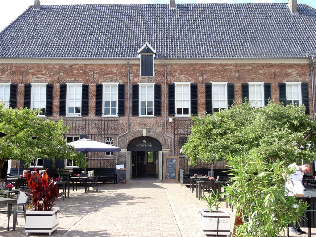 Het café/restaurant ,dat ook op het terrein ligt en een erg mooi terras heeft, is op dit tijdstip (09:30 uur) helaas nog gesloten. We beloven elkaar hier vanmiddag langs te gaan als we na afloop van de wandeltocht per de fiets de auto in Zeddam gaan ophalen. Hierna gaat verder naar Stokkum en lopen we af op de Duitse grens.