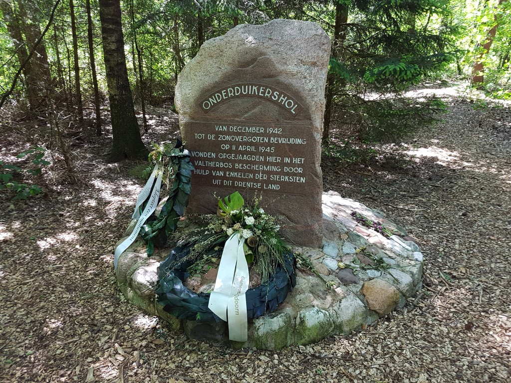 Na Valthe gepasseerd te zijn komen we in het Valtherbos langs het onderduikershol, waar in de oorlog vele joden hebben gezeten. De man die deze joden hielp, Bertus Zefat, een kippenboer uit Valthe heeft z’n moedige daad met z’n leven moet bekopen. Na verraad werd hij door de Duitsers gefusilleerd. De Duitsers hebben het hol nooit ontdekt overigens en de onderduikers hebben de oorlog overleefd.